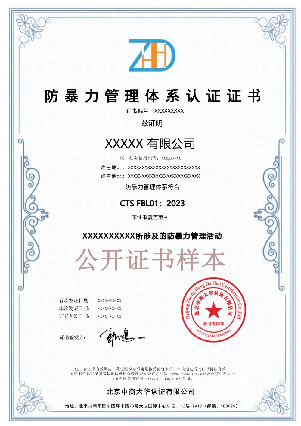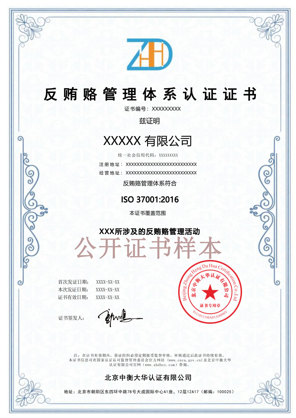 反贿赂管理体系认证证书样本