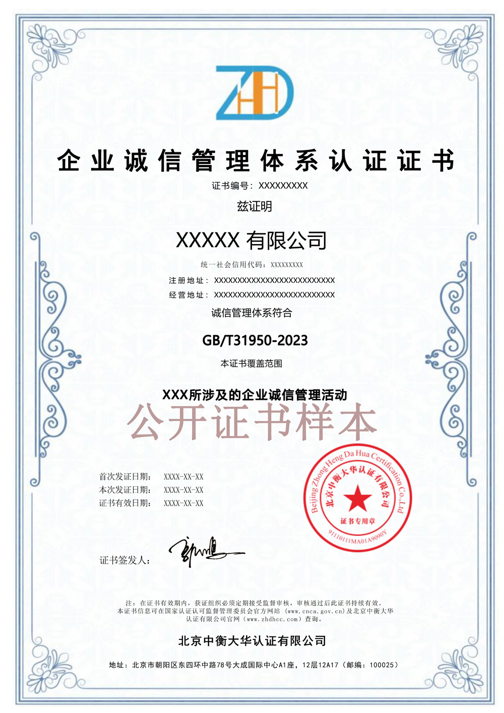 企业诚信管理体系认证证书样本