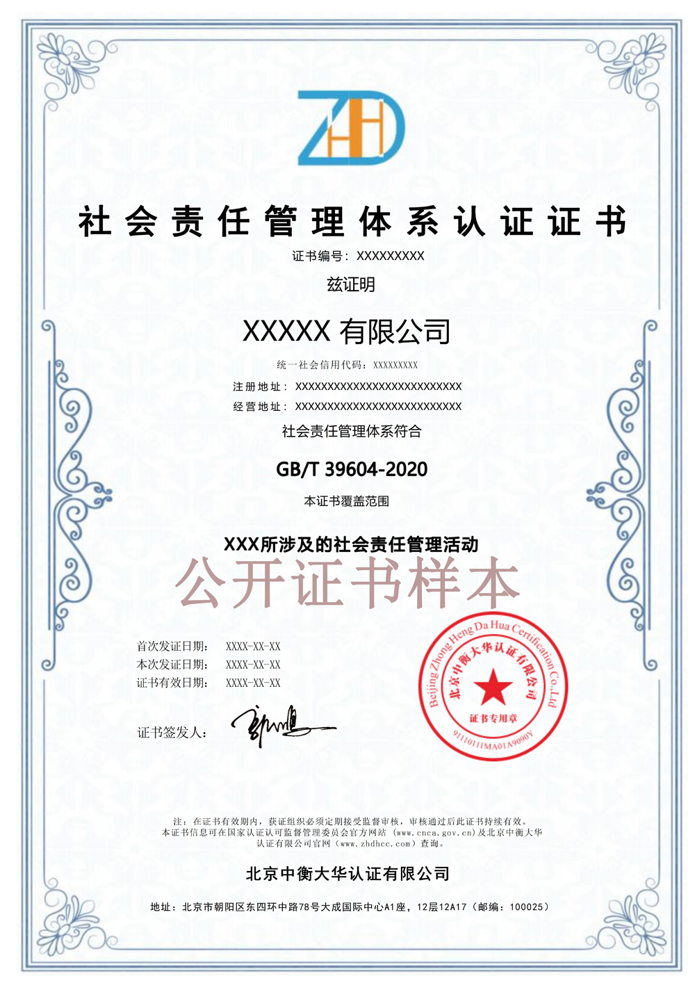 社会责任管理体系认证证书样本